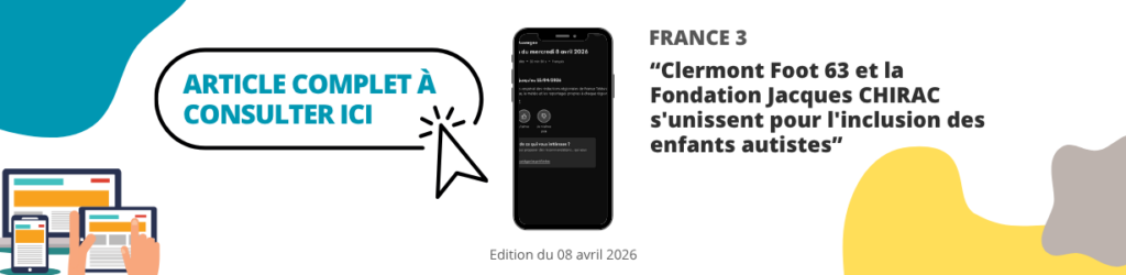 Clermont Foot 63 et la Fondation Jacques CHIRAC s’unissent pour l’inclusion des enfants autistes Article publié le jeudi 9 avril 2026 Accueil Actualités Retourner aux articles « Ce vendredi, le Clermont Foot 63 reçoit Nancy pour la 30ᵉ journée de Ligue 2. Avec une particularité pour ce match, les joueurs entreront sur la pelouse, accompagnés par 23 enfants du pôle autisme Inclusion de la Fondation Jacques CHIRAC. » France 3 Edition du 08 avril 2026