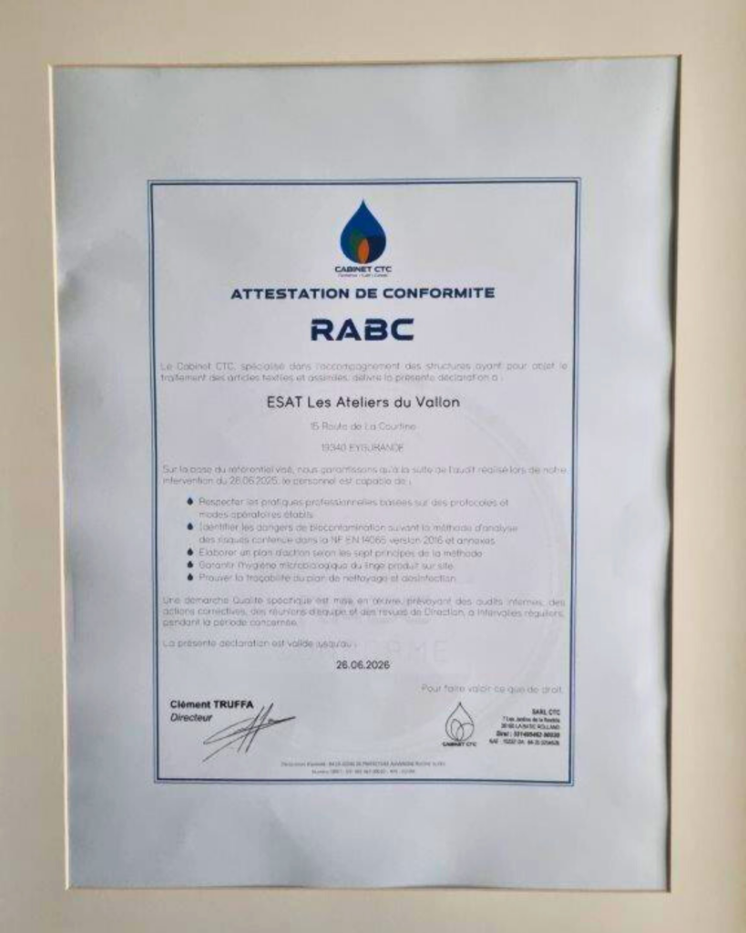 L’atelier blanchisserie de l’ESAT d’Eygurande vient de renouveler sa certification RABC (Risk Analysis Biocontamination Control), une méthode qui permet d’analyser et de maîtriser les risques de contamination microbiologique des textiles traités en blanchisserie, assurant ainsi un haut niveau d’hygiène et de sécurité.