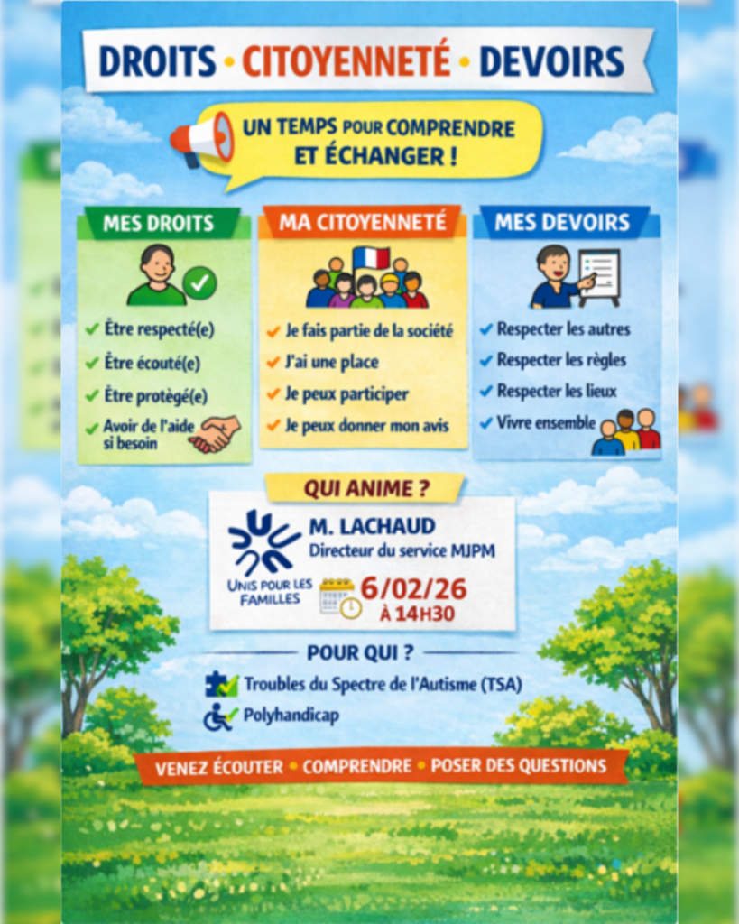 Récemment, les résidants de la Maison de la Vallée des Orgues ont participé à une conférence consacrée aux droits, à la citoyenneté et aux devoirs animé par Monsieur LACHAUD, Directeur du service Mandataire Judiciaire à la Protection des Majeurs de l’UDAF Corrèze (Union Départementale des Associations Familiales). Ce temps d’échange, pensé de manière accessible et pédagogique, avait pour objectif de mieux faire connaître les droits de la personne accompagnée et de rappeler l’importance de leur participation à la vie de l’établissement.